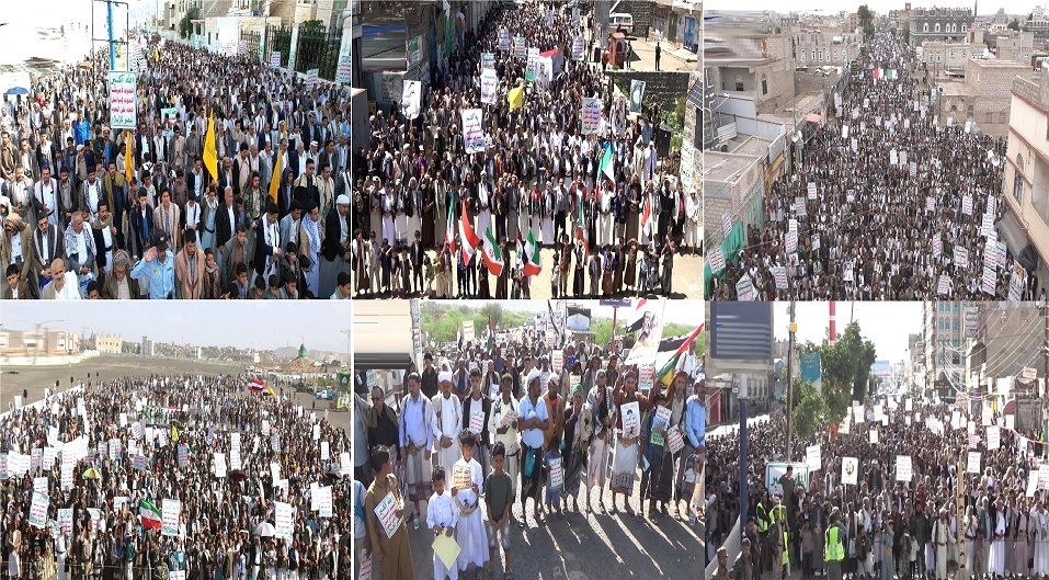 شهدت محافظات حجة وريمة وذمار وتعز ولحج والبيضاء خروج مسيرات مليونية في أكثر من 600 ساحة وميدان عصر اليوم الجمعة 29 شوال تأكيدًا على وحدة ساحات المحور في مواجهة الطغيان.