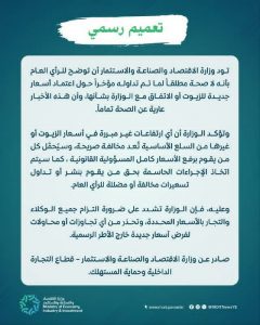 كما حذرت من تداول أو نشر أي تسعيرات مضللة للرأي العام، مؤكدة أنها ستتخذ إجراءات حازمة بحق المخالفين.