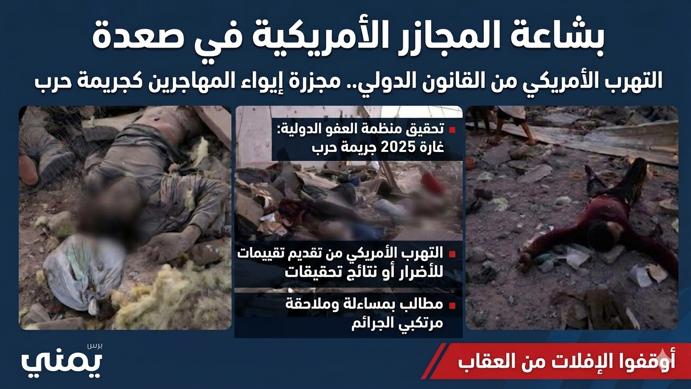 أعادت منظمة العفو الدولية فتح ملف المجزرة التي ارتكبها الطيران الأمريكي باستهدافه مركزا لإيواء المهاجرين الأفارقة في محافظة صعدة، مؤكدة تصنيف الواقعة كـ “جريمة حرب” تستوجب الملاحقة القانونية الدولية.