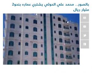 نقلت وسائل اعلام تابعة لمرتزقة العدوان ومرتزقة الإمارات في اليمن صورة لعمارة سكنية مكونة من 8 أدوار قالت أنها تابعة لرئيس اللجنة الثورية العليا محمد علي الحوثي وأنها تقع في شارع المطار في جولة مصعب ، وأنه اشتراها من أحمد عبدالله دارس وزير النفط السابق .