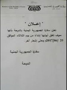 أعلنت السفارة اليمنية في العاصمة القطرية الدوحة، أنها أغلقت أبوابها ابتداءً من اليوم الثلاثاء، الموافق 20 يونيو.