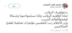 وقال محمد علي الحوثي في منشور على صفحته في موقع التواصل الاجتماعي، لماذا أوقفتم صرف مرتباب الموظفين وكنا نسلمها لهم جنوباً وشمالاً، مطالباً الحكومة بتوضيح الأسباب.
