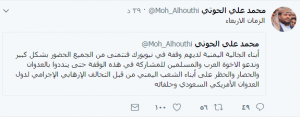 كما دعا الحوثي في تغريدة له على تويتر ابناء الجاليات العربية والمسلمة إلى المشاركة الواسعة في التظاهرة في نيويورك . متمنياً من الجميع الحضور بشكل كبير للتنديد بالعدوان والحصار والحظر على أبناء الشعب اليمني من قبل التحالف الإرهابي الإجرامي لدول العدوان الأمريكي السعودي وحلفائه.
